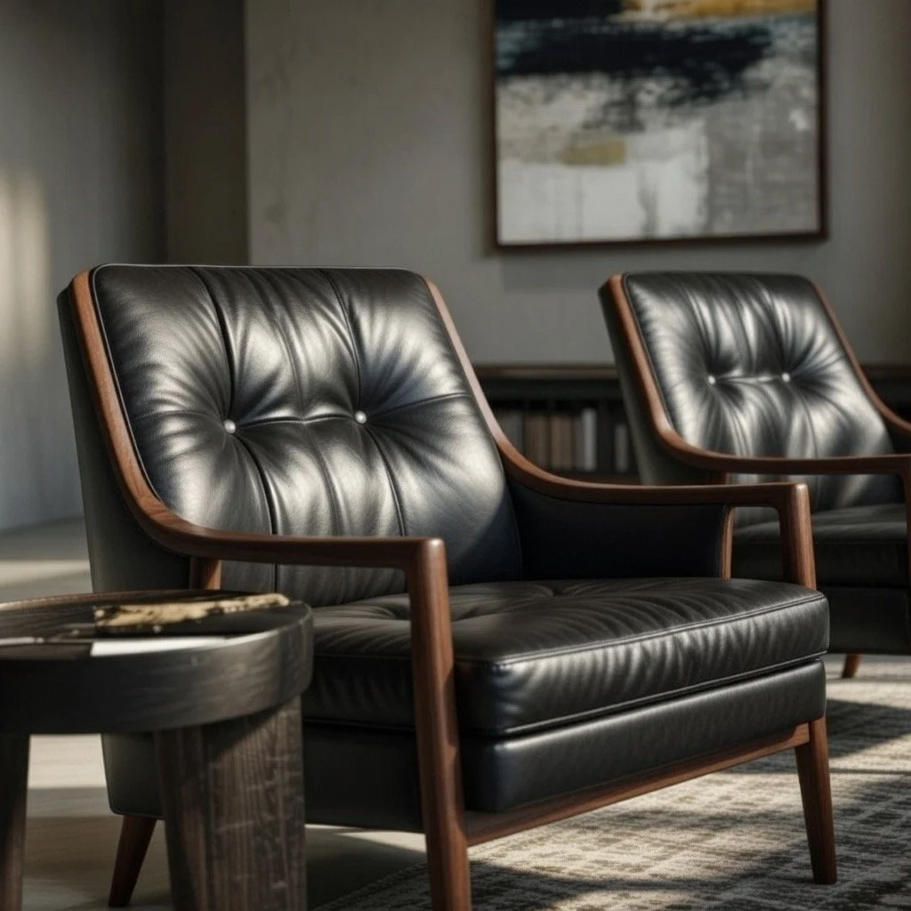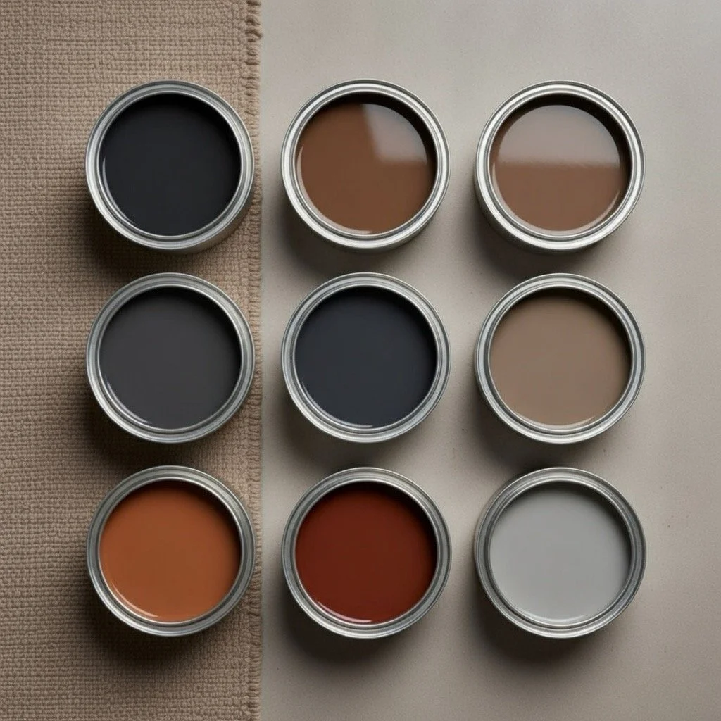 Deep charcoals, softened blacks, and natural wood tones.